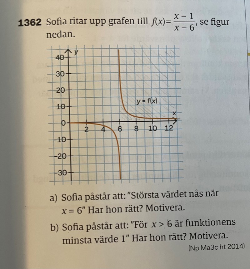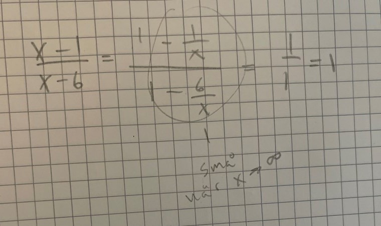 2) När x blir stort blir alltså kvoten (x-1)/(x-6) nästan lika med 1, är du med på det?