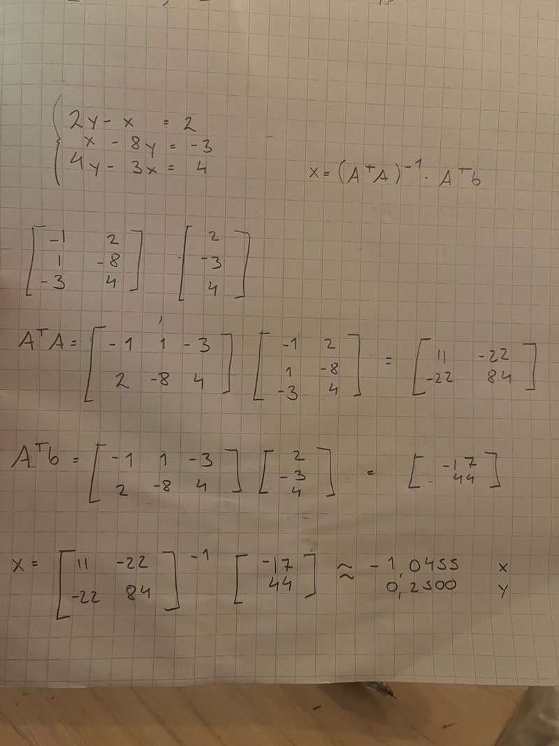 Lös ekvationssystemet nedan. Ifall ingen exakt lösning finns, så bestäm en minstakvadratlösning.