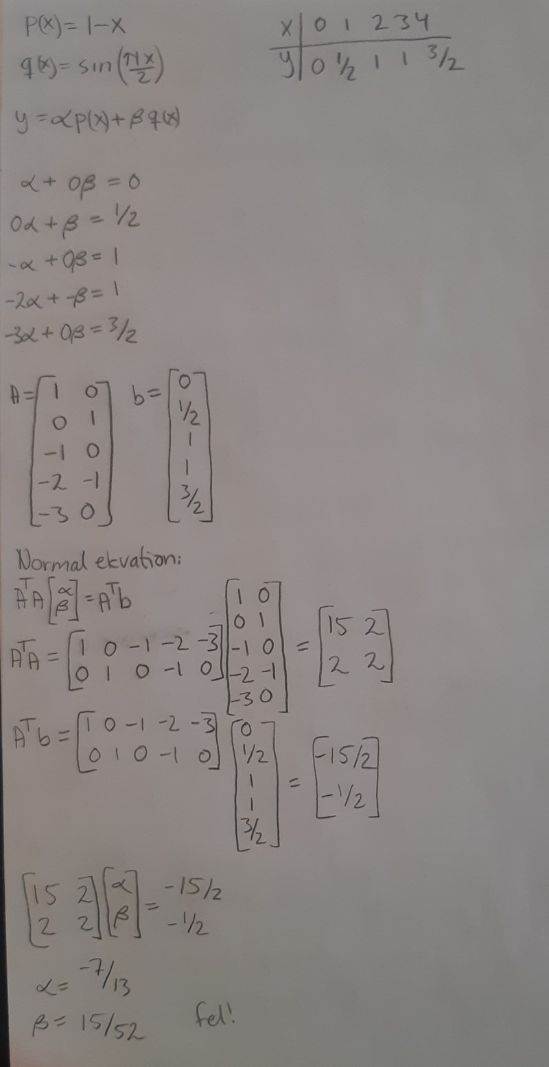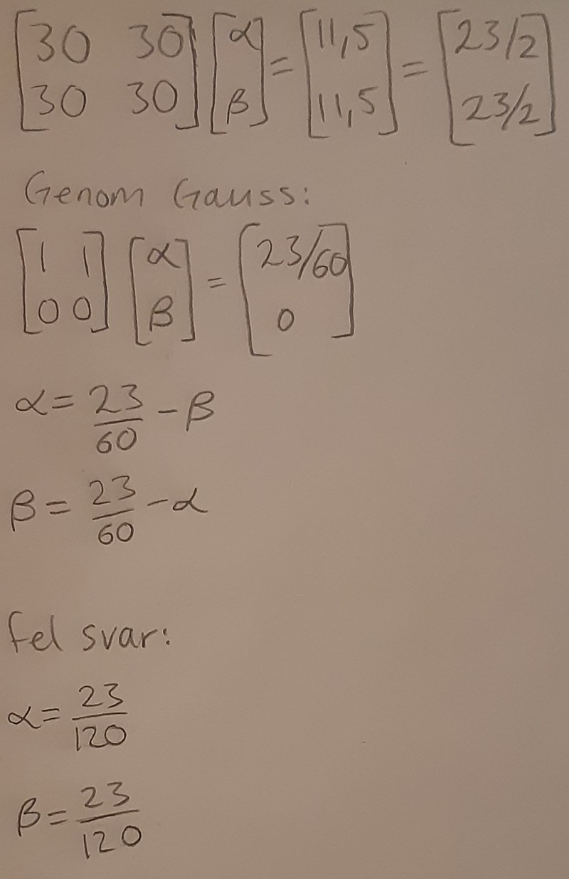 Har också försökt att sätta in värdena i första ekvationen där jag använde mig av x=2 och y=1 men fick fel. (Fick alpha= -7/30 och beta= 37/60).