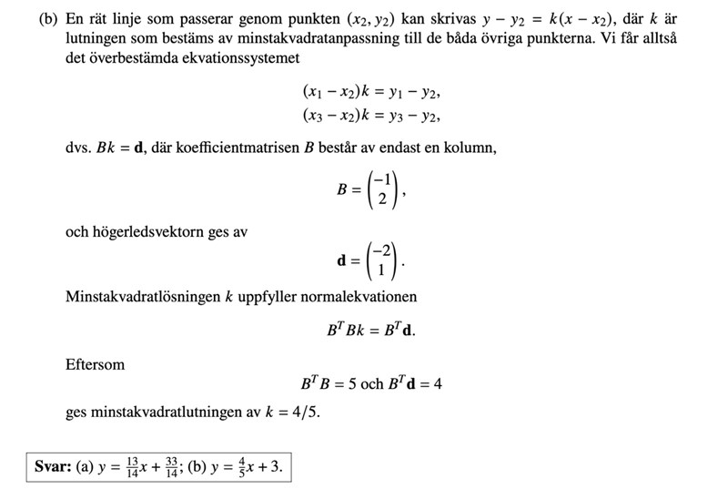 I fråga a) skall vi estimera två parametrar (m och k) och har tre datapunkter. Matrisen blir 3 x 2.