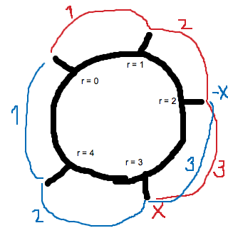 Moduloräkning fungerar som ett snurrande hjul. Räknar du med modulo n, kan du aldrig få en större rest än n - 1. De möjliga resterna för n = 5 är alltså r = 0, 1, 2, 3, 4. Vi vet att x har resten 3. Det innebär att avståndet till närmaste multipel av fem är tre steg. Minus x har samma avstånd till just denna multipel av fem, men vi måste gå åt andra hållet eftersom vi går åt motsatt håll på tallinjen.
