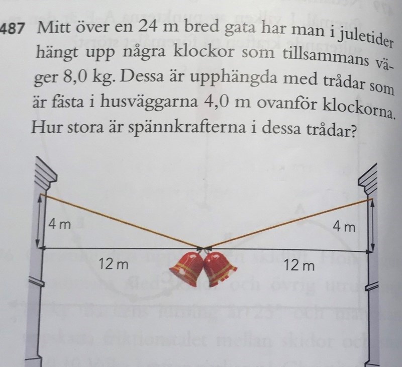mrpotatohead skrev:En kraft rakt upp från klockorna kommer vara den totala y-komposanten från båda spännkrafterna. Eftersom avståndet är lika åt båda hållen kan du räkna y-komposanten/2.