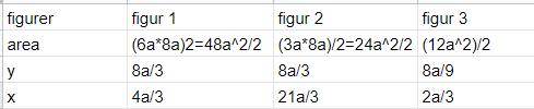 tabellen är del av lösningen. För att hitta mitt punkten på figuren. Man kan göra en tabell. För tydlighet. I tabellen ska man lägga alla figurens mittpunkt(x , y) och arean. Jag kan inte lista ut figuren så delade jag det i tre stycken delar. För att det blir lättare. Formen blir då x1A + x2A -x3A/ area och y1A + y2A +y3A/A