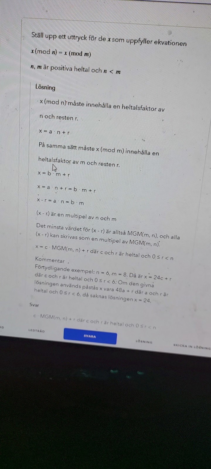 Marilyn skrev:Nej, jag förstår inte ditt resonemang. Men jag pekar på att det är olämpligt att skriva kvoter som x/m eller x/n, eftersom de saknar mening i moduloräkning ifall de inte går jämnt upp. Och jag ger ett motexempel till ditt svar (som inte är så särskilt lättläst).