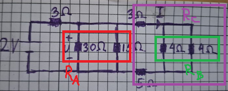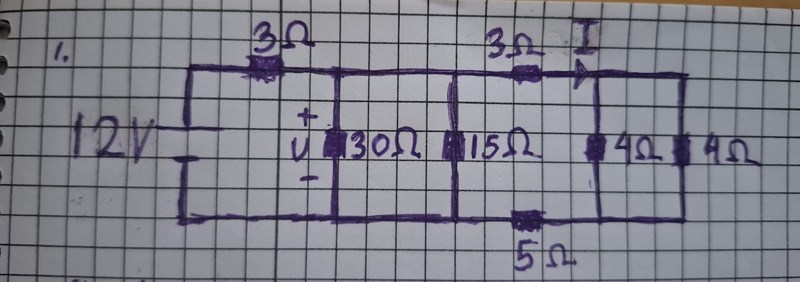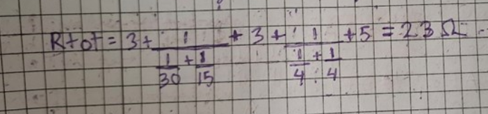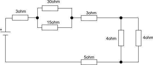 Rtot= 3 + 1/1/30+1/15+1/3 + 1/1/4+1/4 + 5 = 12,3 ohm