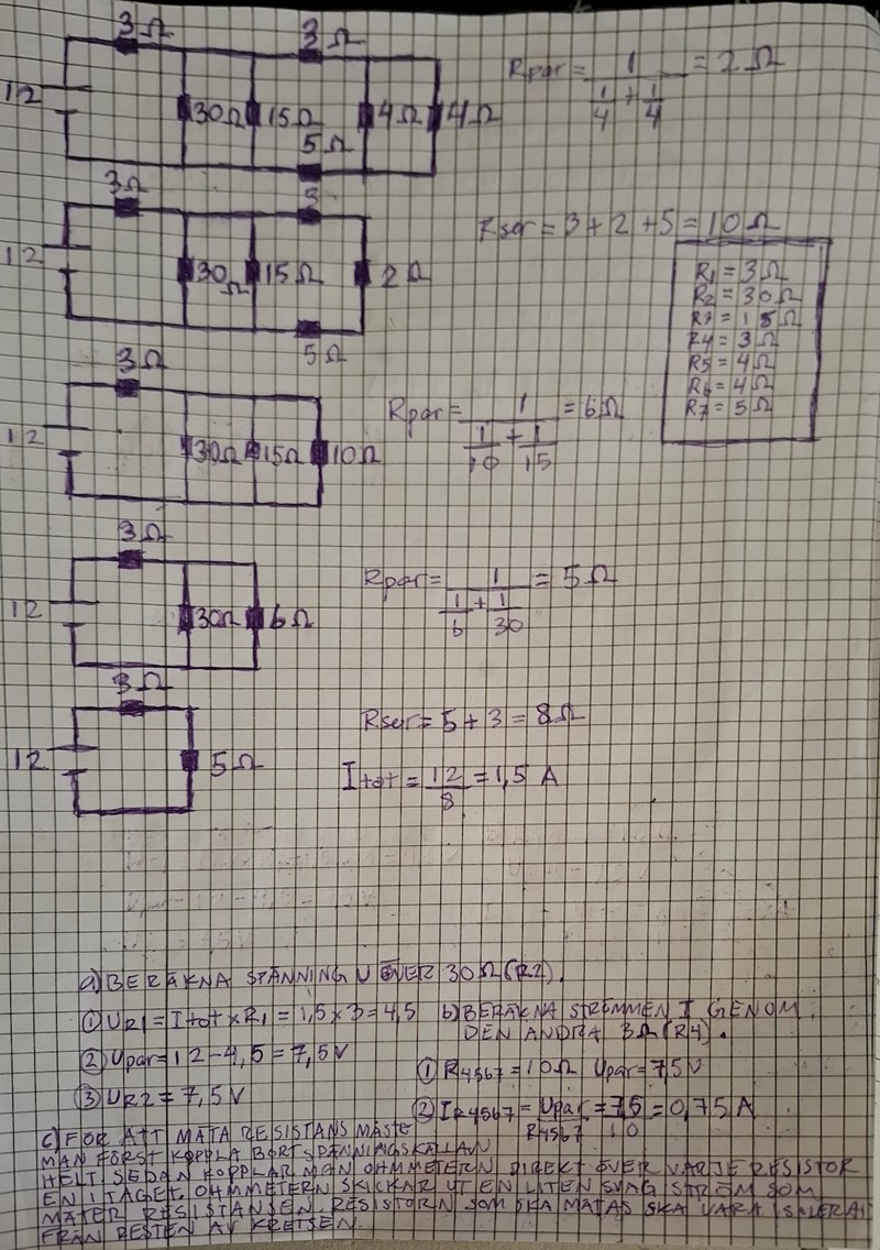 Jag tittade på en video med liknande resistansnät och började succesivt gå igenom resistorerna och om de var parallellkopplade eller seriekopplade. Så nu tror jag att det äntligen har blivit rätt!