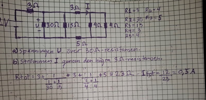 sictransit skrev:Emmabee skrev:Om jag räknar såhär:Rtot= 3 + 1/1/30+1/15+1/3 + 1/1/4+1/4 + 5 = 12,3 ohm