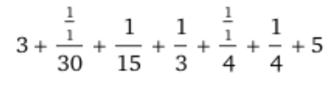Emmabee skrev:Om jag räknar såhär:Rtot= 3 + 1/1/30+1/15+1/3 + 1/1/4+1/4 + 5 = 12,3 ohm