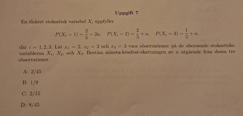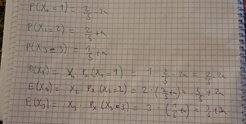 Jag räknade separat väntevärde för varje s.v och det blir ändå fel svar på a när jag skattat den. Är det så att alla X1 ,X2 och X3 skall ha samma väntevärde enligt formeln för MK-skattning och varför kan inte varje s.v ha sitt eget väntevärde som jag räknade med?