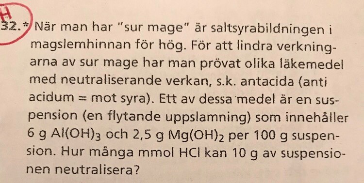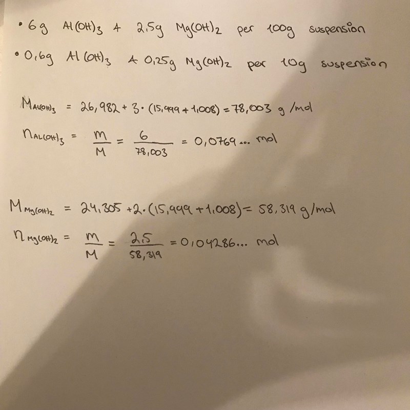 Hur många mol av aluminiumhydroxid respektive magnesiumhydroxid har du? Hur många mol grupper som kan neutralisera syra? Hur många millimol syra borde de tillsammans kunna neutralisera?
