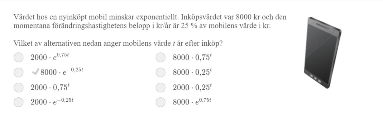 8000*0,75^t. Vilket är det jag skrev i min fråga. Fast rätt svar är 8000*e^(-0,25t)