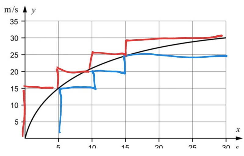 - Du kan approximera arean under grafen med rektanglar och då ta medelvärdet av en överskattning (röd) och underskattning (blå) av arean, se bild. Denna indelning kan du göra grovt enligt bild eller mer finmaskig om du vill få bättre närmevärde.