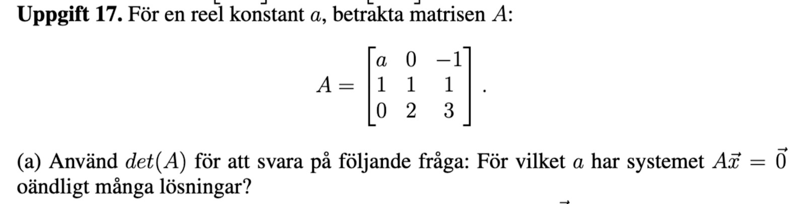 Jag beräknar determinanten för A och får då ... = a(1)-1(-2) = a + 2