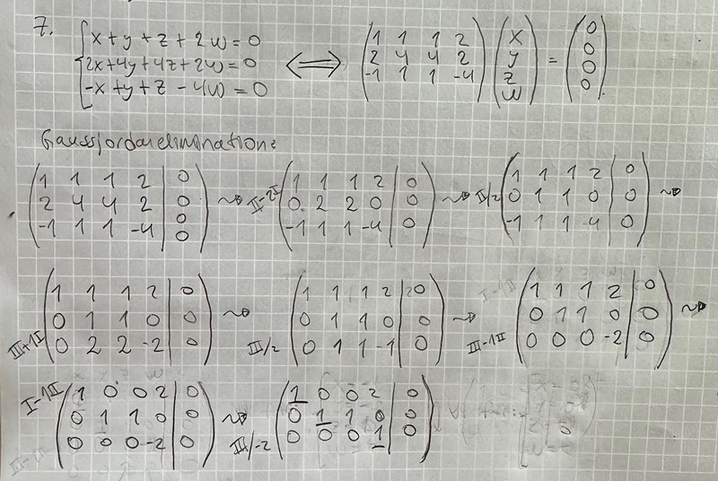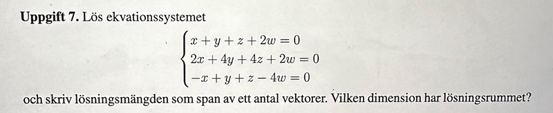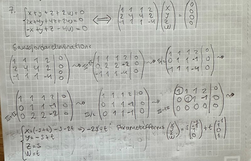 Tänkte att jag skulle gaussa så jag får ut värden för x, y, x och w för att sedan använda dem och sätta in i parameterform. Utifrån den parameterformen sen ta fram span för vektorerna.