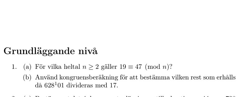 Jag behöver hjälp med att förstå denna uppgift. Har letat i boken men jag hittar inte liknande uppgifter. Det finns tal där jag får modulo, men jag vet inte hur jag ska räkna när mod är n? Och för b) kan någon förklara vad som menas med den upphöjda ettan mitt i ett tal? Jag är bara van med att se det efter ett tal. Uppskattar hjälp:)