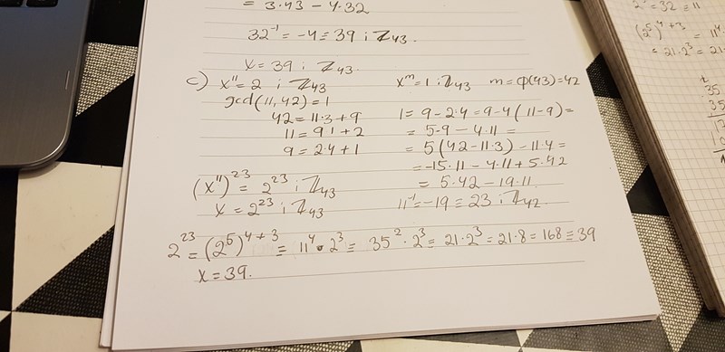 Jag löste ekvationen och lösningen är bifogat i följande bild. samt jag har bifogat facit. Jag får samma resultat som i facis men min fråga är varför i facit har de använt 19 som den multiplikativa inversen till 11.