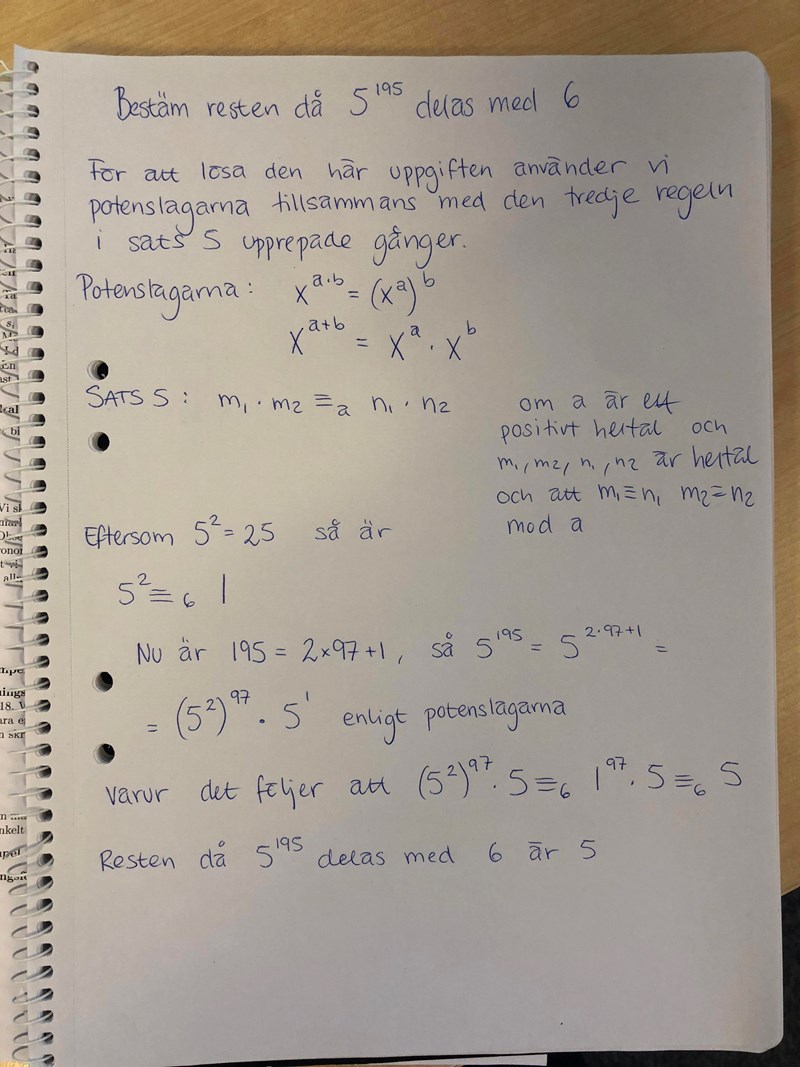 Uppgiften lyder "Vad blir resten då 5^195 delas med 6?".