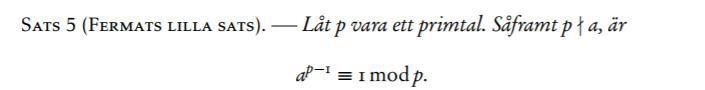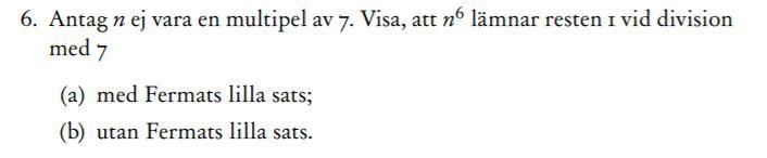 Om n=1 161 (modulo 7)n=2, 26=641 (modulo 7)n=3, 36=272-12 n=4, 46=22616 =1n=5, 56=52343 =26och det vet vi är ettn=6, 66=623363 =13=1