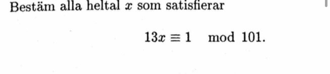 Kongruensekvivalensen betyder att talet 13x ska ha resten 1 vid division med 101. Enligt divisionssatsen finns det heltal x och q så att