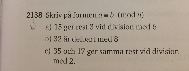 Min fråga är nu följande: Om vi vet att "35 och 17 ger samma rest vid division av 2" kan skrivas som varför betyder det i a inte att 15 och 3 ger samma rest vid division med 6 för de skrivs ju ut på samma sätt?
