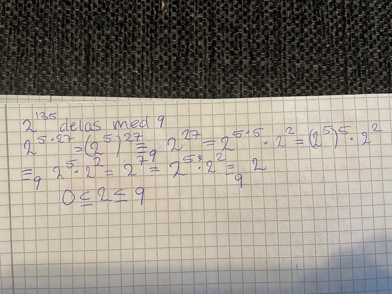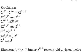 Jag har suttit med en uppgift som lyder "Bestäm resten då 2^135 delas med 9. " då jag har kommit fram till att det gäller moduloräkning och detta är min uträkning: