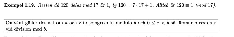 din lösning bra ut nu, men vi vill också att du visar att resten helt säkert måste vara 4 och tex inte 4+5=9 genom att verifiera att talet 4 utöver kongruensrelationen 3^162≡54 även uppfyller en särskild olikhet som används för att definiera resten. Du kan läsa om denna olikhet i rutan under exempel 1.19 i kurslitteraturen.