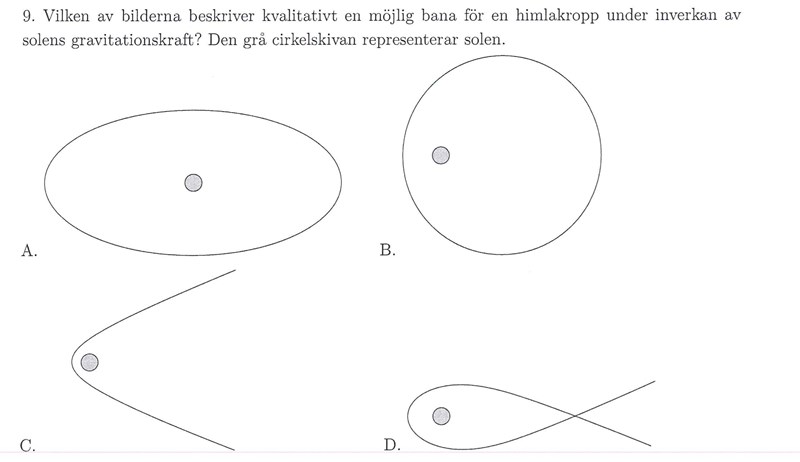 Jag hade gissat på B, eftersom det är så jordens bana runt solen ser ut. Men det är fel av någon konstig anledning. Någon som har en gissning på varför C är rätt alternativ?