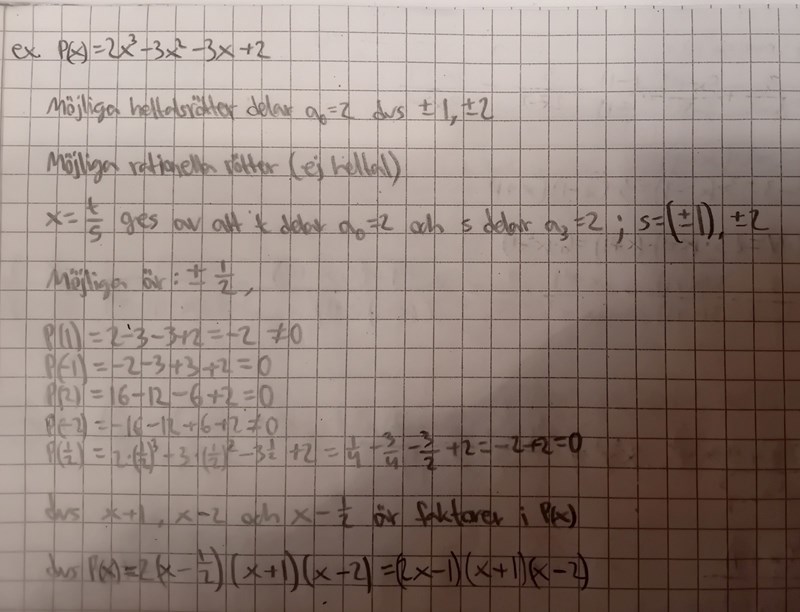 Jag går igenom mina anteckningar och jag förstår inte hur man kommer fram till att möjliga rationella rötter är +-(1/2)? Både t och s ska ju dela 2 vilket är om s eller t är +-(1) och +-(2) då borde det väl kunna bli +-(1/2), +-(2/1), +-(1/1) och +-(2/2)
