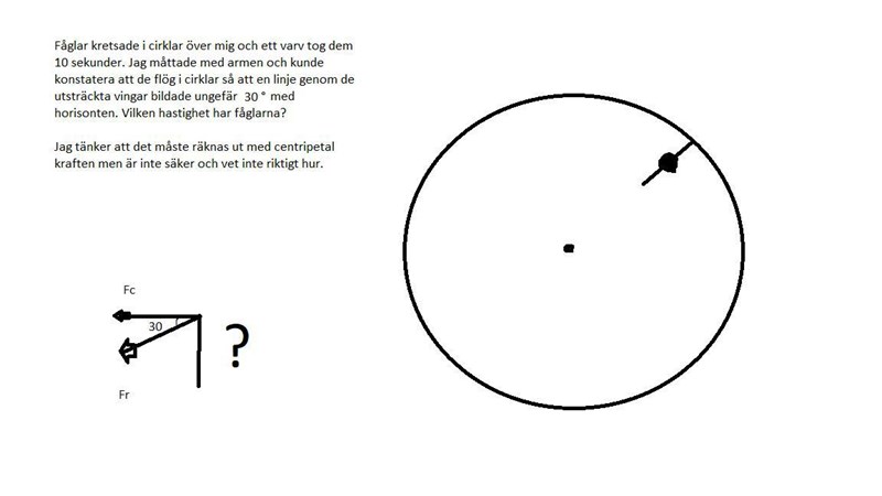 Är det möjligt att räkna ut det här utan ett antagande på t.ex. de utsträckta vingarnas längd? Hur går jag tillväga? Tänkte först om man ska räkna med centripetal kraft men förstår inte riktigt hur. Tänkte sen om man kanske kan använda sig av likformiga trianglar där man antar en vinglängd samt antar en hand längd.