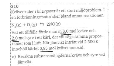 Det fanns ingen kvävemonoxid från början, så all kvävemonoxid har bildas genom att syre och kväve har reagerat. Använd reaktionsformeln för att beräkna hur mycket syre och kväve som har förbrukats, och sedan hur mycket som finns kvar.