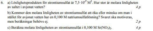 Började formulera det som att: om man löser SrSO4 i Na2SO4 så finns det redan plats upptagen av SO4^2- joner - då ... men sen fastnar jag. Jag vet att Ksp är konstant oavsett koncentrationer.