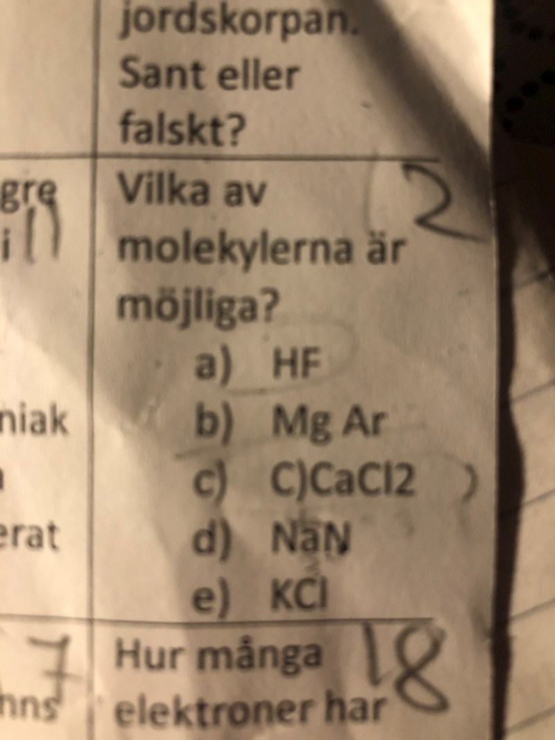 Om man istället kollar på "MgAr" så ligger magnesium i grupp 2 och har därför två valenselektroner, medan argon ligger i grupp 18 och har därmed åtta valenselektroner. Eftersom argon redan har åtta valenselektroner är den atomen nöjd och vill inte ha fler valenselektroner. Därför är inte "MgAr" någon möjlig förening.