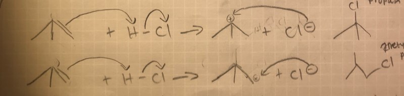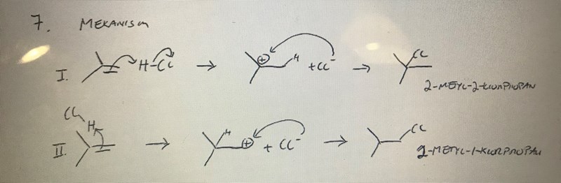 När man skulle skriva en reaktion med 2-metylpropen och saltsyra där det bildades 2-metyl-2klorpropan och 2-metyl-1-klorpropan ritade jag på följande sätt.