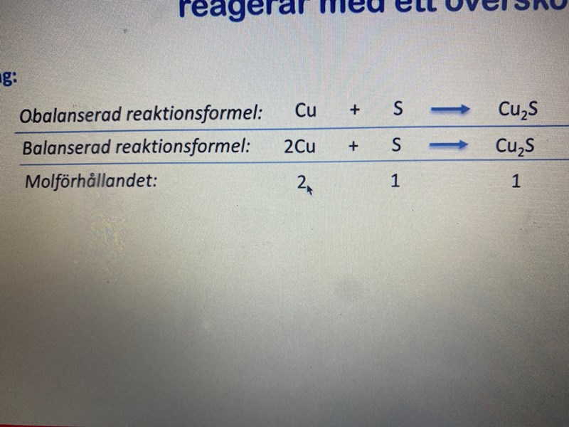 2 mol koppar och 1 mol svavel reagerar så att det bildas 1 mol kopparsulfid.