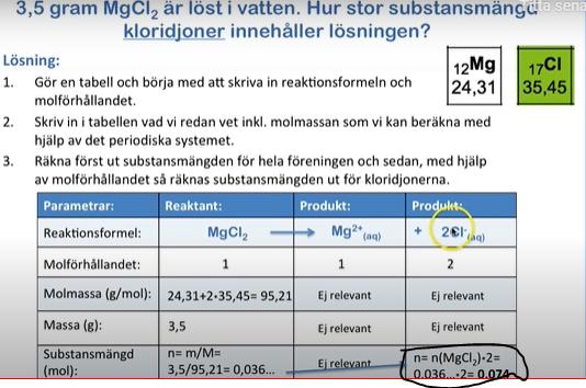 vi har fått fram substansmängden magnesiumklorid genom (n=m/M) till ca 0,036 och de är i frågan ute efter substansmängden av kloridjoner. och eftersom vi vet att molförhållandet är 1:2 så multiplicerar man sedan substansmängden magnesiumklorid med 2?? (för det var två ggr så mkt kloridjoner)
