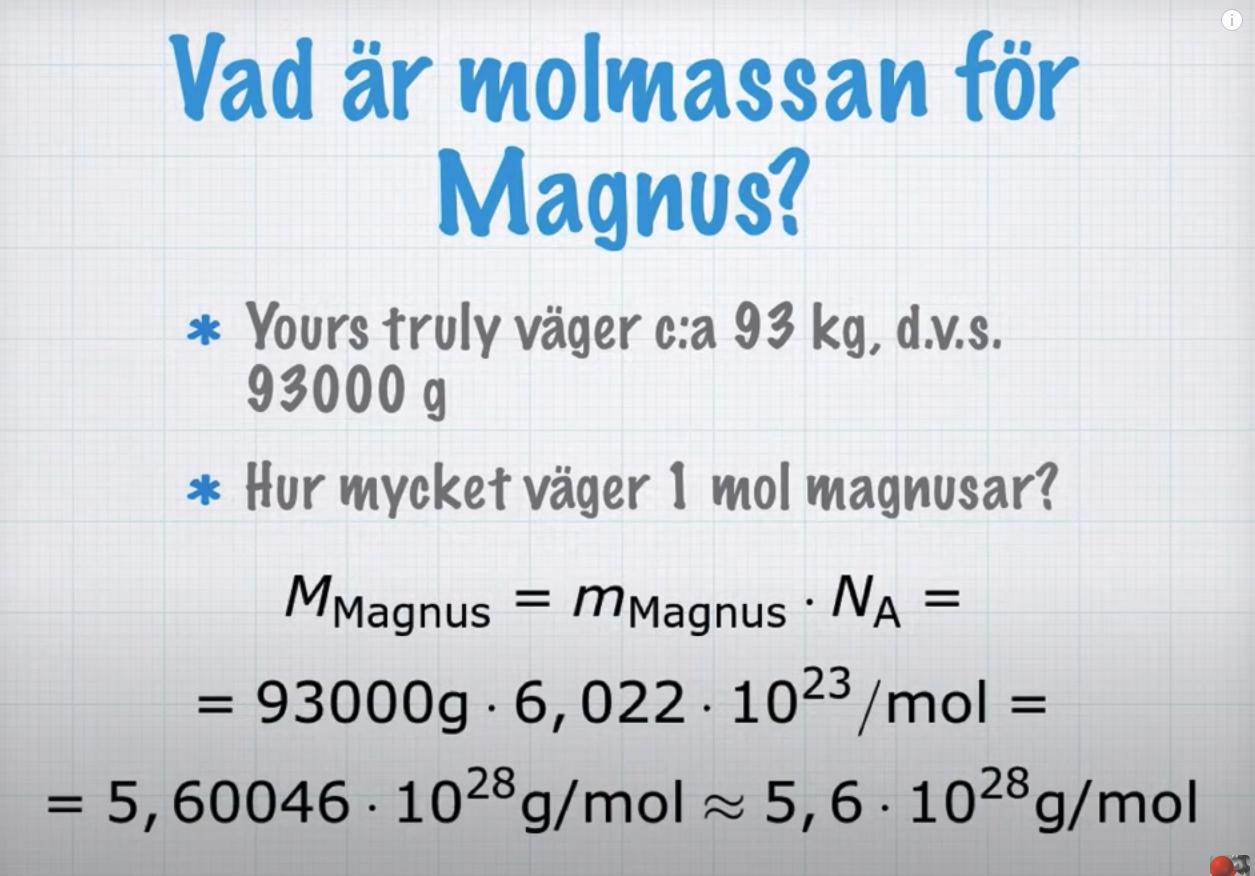 Vilken massa har 1 mol Magnusar, d v s 6,022.1023 stycken Magnusar? Detta är ju massan för 1 mol magnusar, så vi får molmassan genom att dela denna enorma massa med 1.