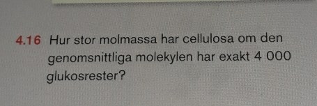 Det står i facit att svaret på hur stor molmassa cellulosa har (med 4000 glukosrester), ska bli 648 kg/mol. Men hur får man detta?