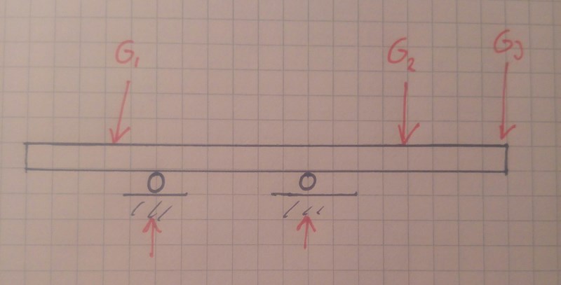 Om du sätter stödet till höger som momentpunkt så måste du multiplicera alla krafter med avståndet till denna punkt. Kraften i det vänstra stödet, G2 och G3 kommer att ge bidrag medurs i momentet och G1 moturs