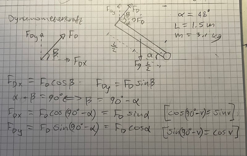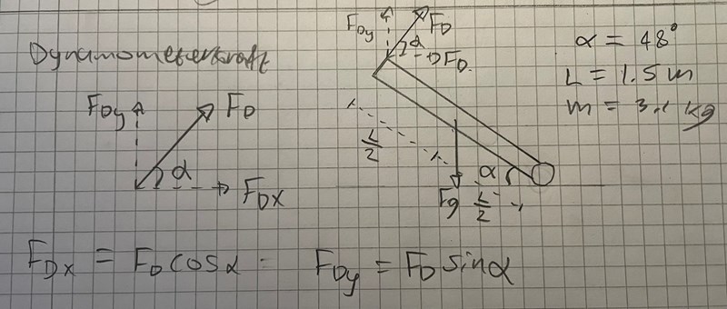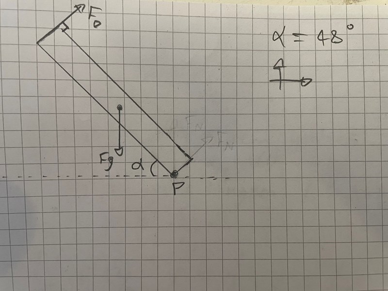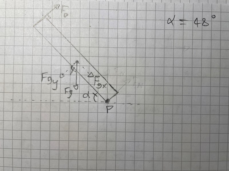 När du räknar ut FD behöver du komposantuppdela mg så att du får fram den mot stången vinkelräta kraften som bidrar till momentet på stången. P behövs inte här eftersom vi räknar på moment runt punkten P