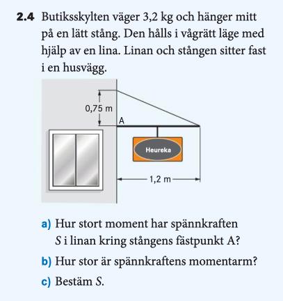 Eftersom det råder momentjämvikt kommer spännkraftens moment och skyltens tyngds moment vara lika. Vad är skyltens tyngds moment runt A?