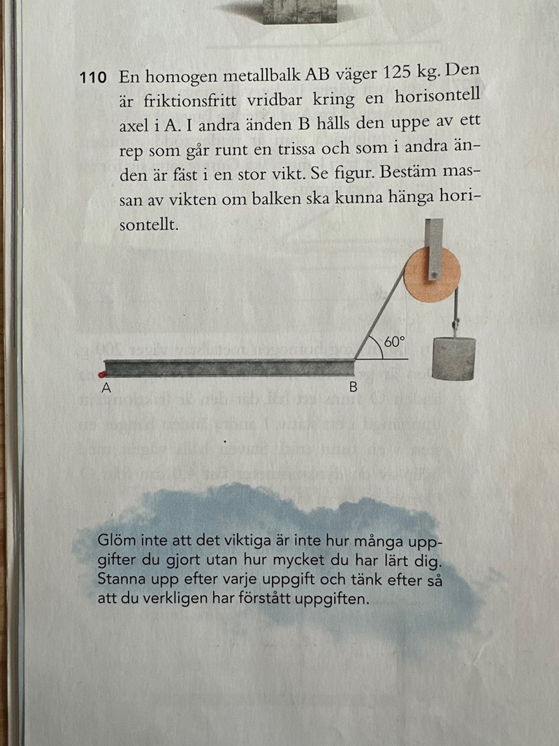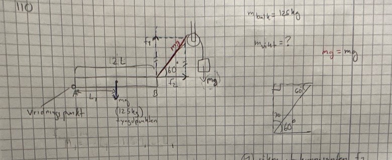 Däremot gäller momentjämvikt kring A, att medursmomentet genererat av mg är lika stort om motursmomentet genererat av F1.