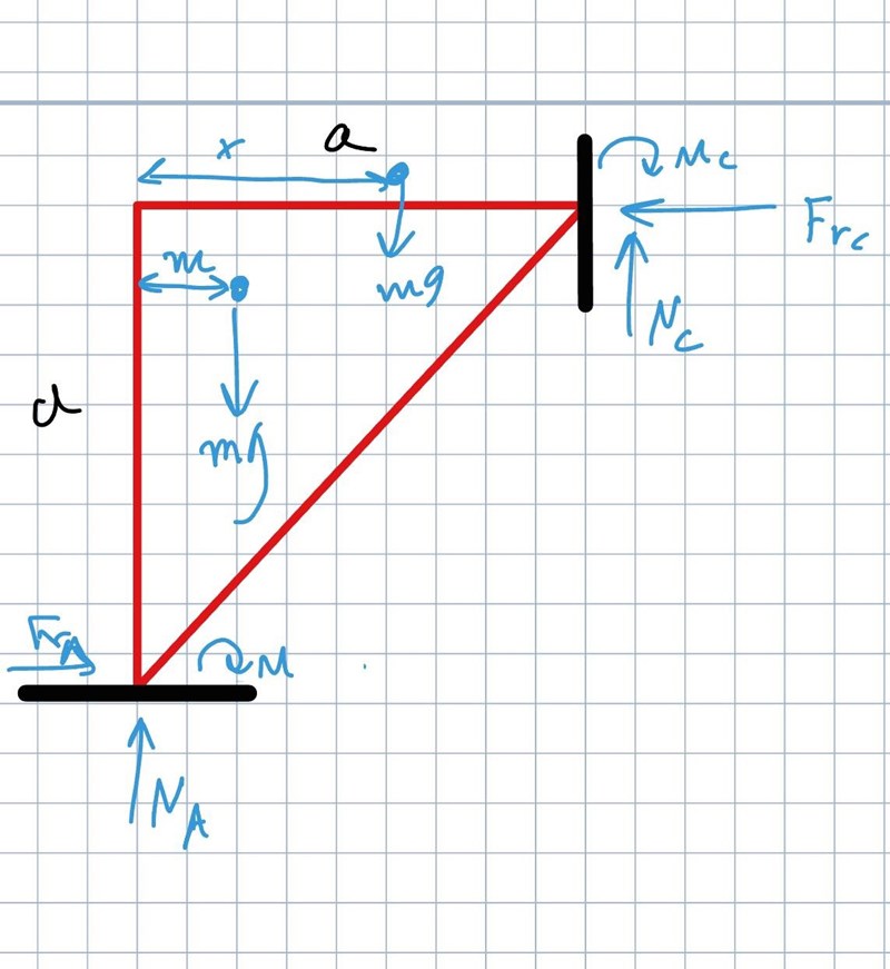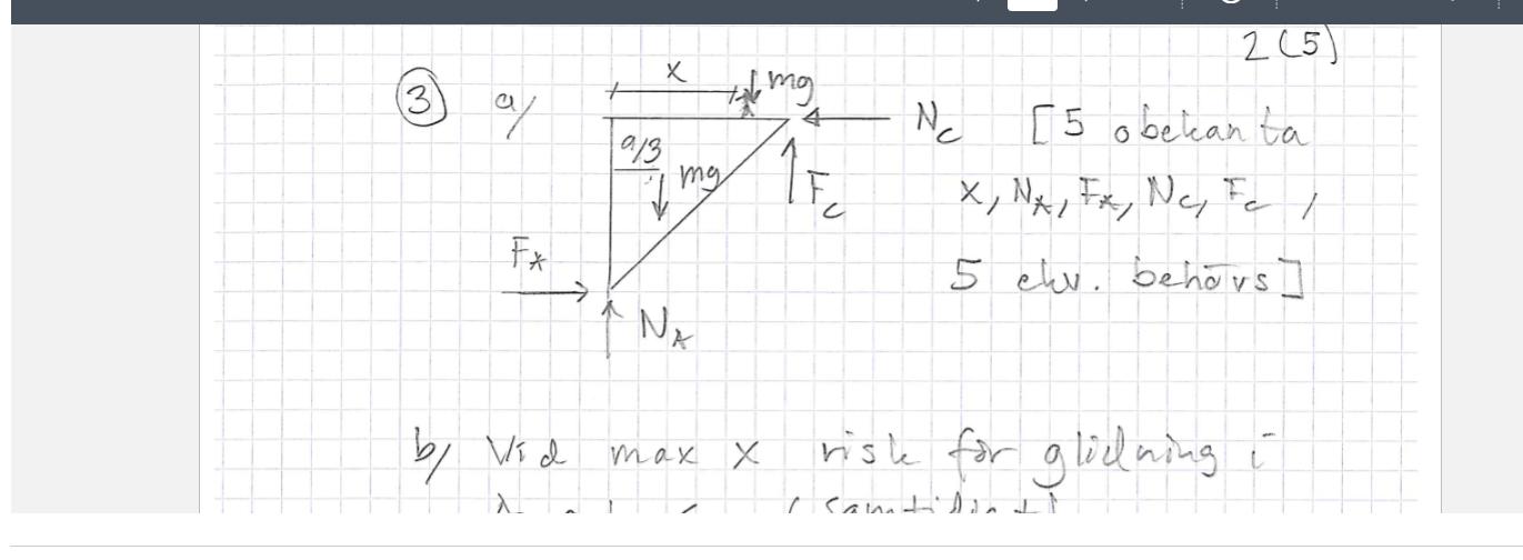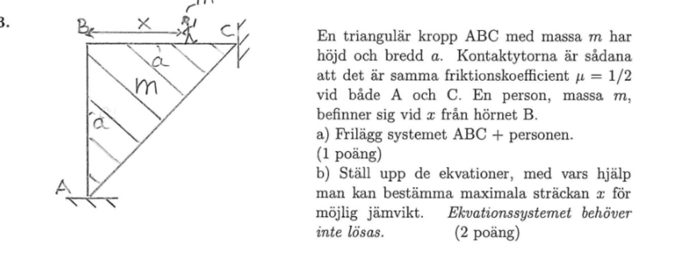 PATENTERAMERA skrev:Om det var så att triangeln satt fast vid A och C så är ju informationen om friktionskoefficient helt överflödig. Så man borde kunna sluta sig till att man inte tänkt sig att triangeln sitter fast.