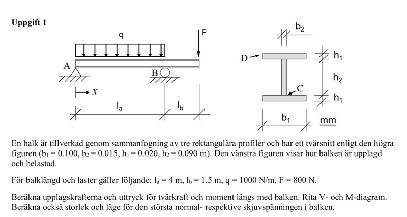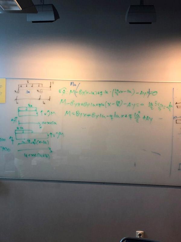 Hej! Vill ha ett uttryck för momentet för det andra snittet (dvs snittet mellan utbredda lasten och F) men när jag lägger in mina värden verkar detta inte stämma. Har kontrollerat detta flera gånger men hittar inte felet. Uppskattar hjälp!