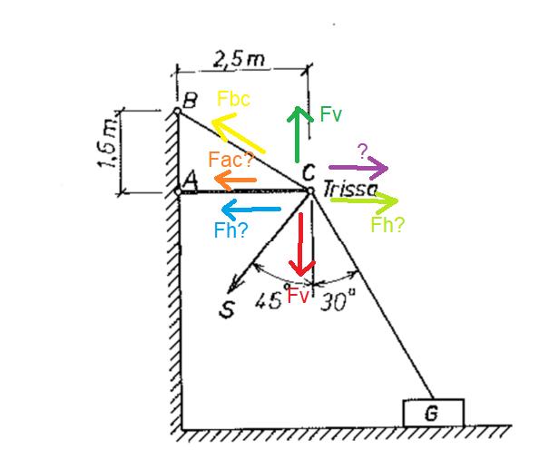Du har lite för många pilar i din figur. Det finns bara 4 krafter som sagt. Rita in dem. Kraften i repet SG och i repet BC är lätta att rita då det säkert är dragkrafter. I stången vet du inte vilken riktning den har men du vet att den är horisontell. Den kan gå åt vänster eller höger men det spelar ingen rolll hur du ritar bara du räknar rätt så ger tecknet i ditt slutresultat rätt riktning. Om du får ett positivt svar så har du ritat rätt, blir svaret negativt så går kraften i andra riktningen.