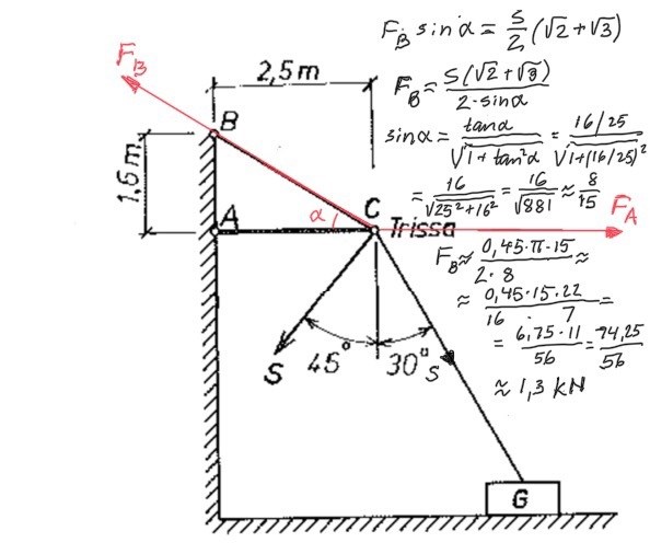 Om du tittar på punkten C (trissan) så har du 4 krafter som påverkar den. Kraften FS i repet S och eftersom repet ligger över en trissa så har du samma kraft i repet mot G, FG.