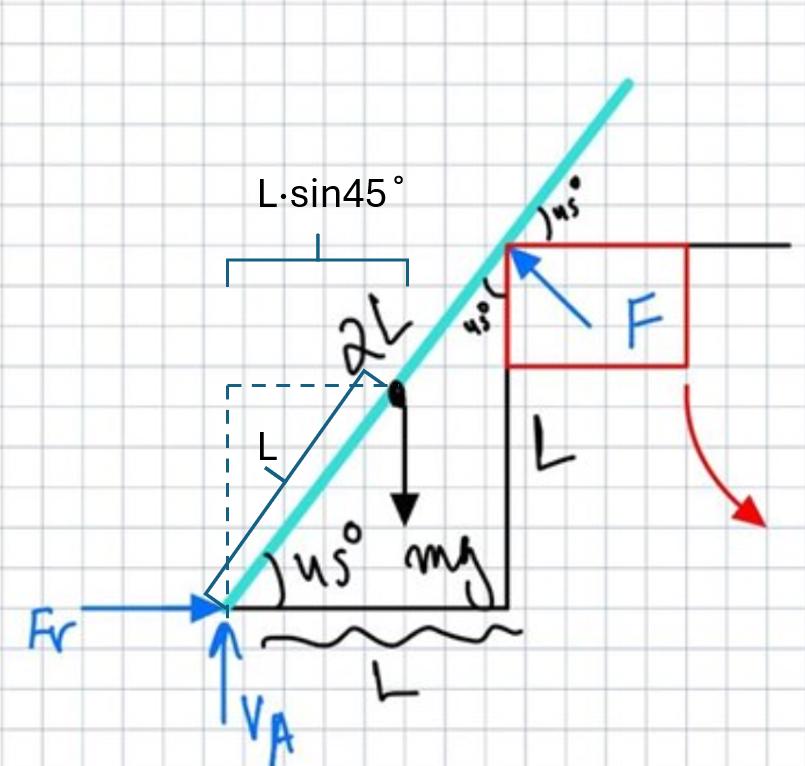 Du har delat upp momentet från normalkraften i två bidrag, och det kan du ju göra om du vill. Men hur har du tänkt när du säger att momentarmen relativt punkten A har samma längd L för tyngdkraften? Kan du rita in momentarmen i din bild?