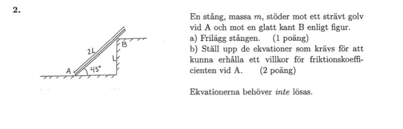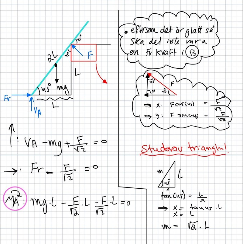 Det hjälper mycket att du sa att båda jag och facit använder samma koordinatsystem, men jag förstår inte hur facit räknar den vinkelrätta avståndet som (mg) har till moment punkten A, alltså L/sqrt(2).