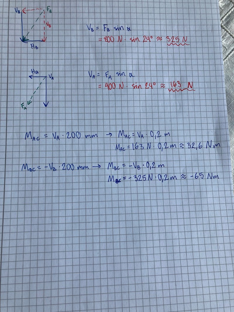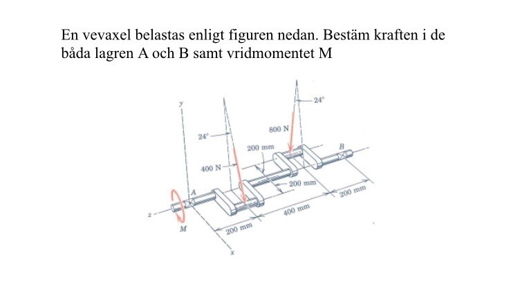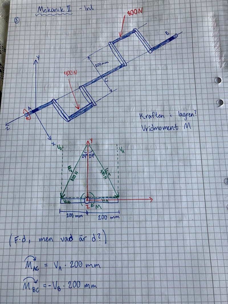 Hej! Jag har försökt lösa den här uppgiften som vi fått men blir inte riktigt klok på den. Nu har jag testat en metod men känns som det är för enkelt att ta reda på krafterna i A och B på detta sätt. Har jag missat något steg? Det finns ju ett avstånd mellan krafterna och punkterna till exempel. Tycker det är svårt att förstå från frågan vad det är jag ska lösa ut, ska jag t ex projicera krafterna på en linje, dela upp i delsystem eller hur börjar man liksom? Hade jag vetat vilken metod jag skulle använda hade det varit till stor hjälp. Vet inte heller vad lagren är men gissar att det är kraften på punkterna A och B som jag ska bestämma. Hoppas någon vänlig själ kan hjälpa mig på traven :)