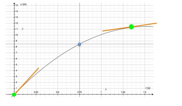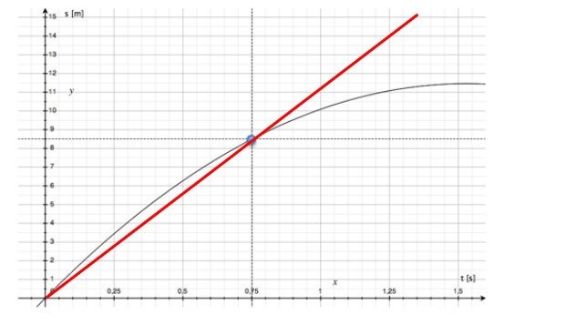 Men då ritade jag inte 2 tangenter som du gjorde. Jag ritade nämligen bara en tangent där punkten ligger. Punkterna blev då (0.4s;6m) (1,2s;12m) = v = (12m-6) / (1,2-0.4s) = 6m/0.8s = 7.5m/s