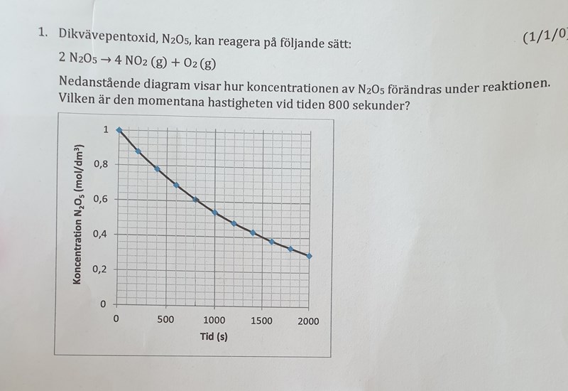 Rita en tangent till kurvan i punkten t=800. Läs av två punkter på tangenten och beräkna reaktionshastigheten.